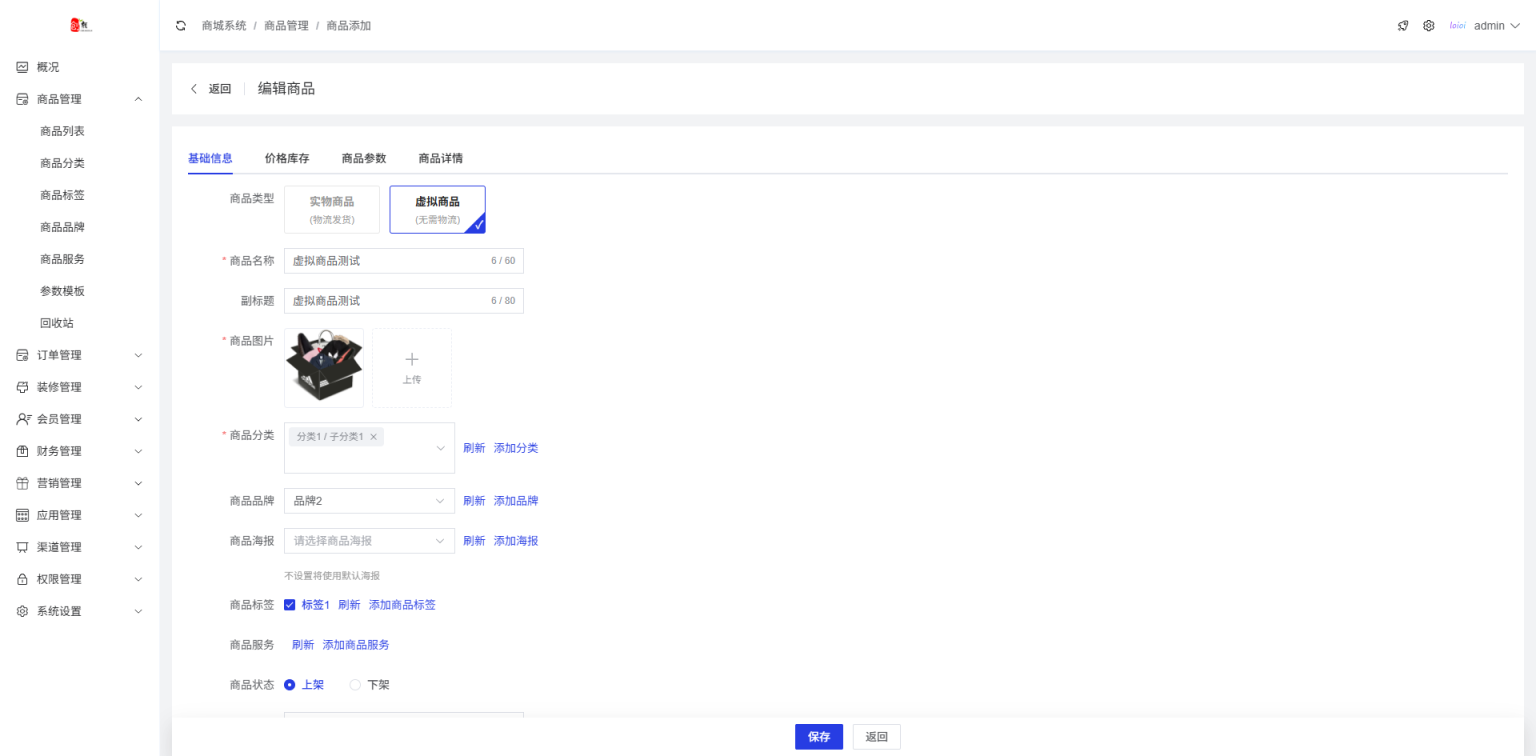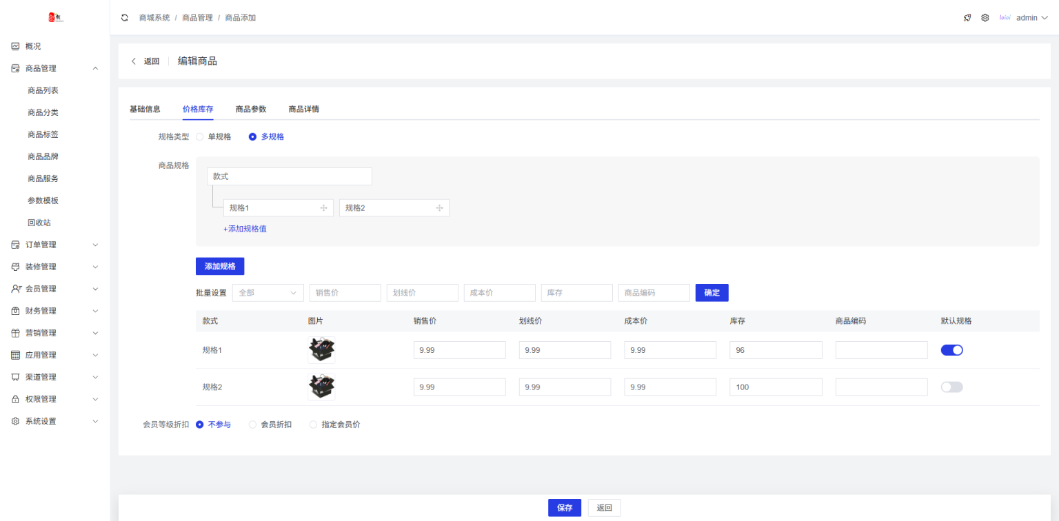 商品类型支持实物商品和虚拟商品,支持多规格,带有商品评论功能,订单支持申请退款和批量发货,商品带海报推广功能
