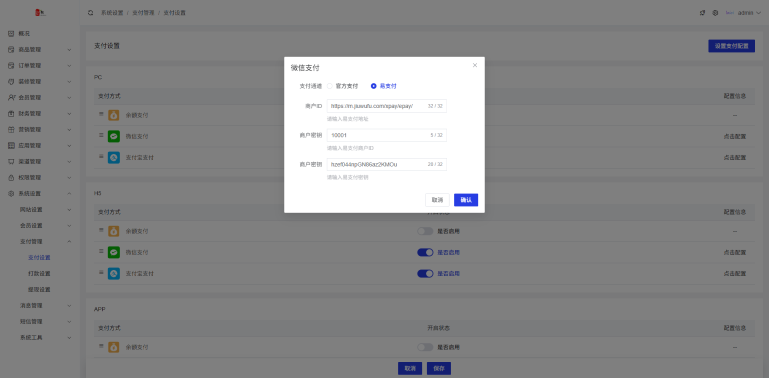 支付对接微信、支付宝官方和第三方易支付,分站支持单独设置支付接口